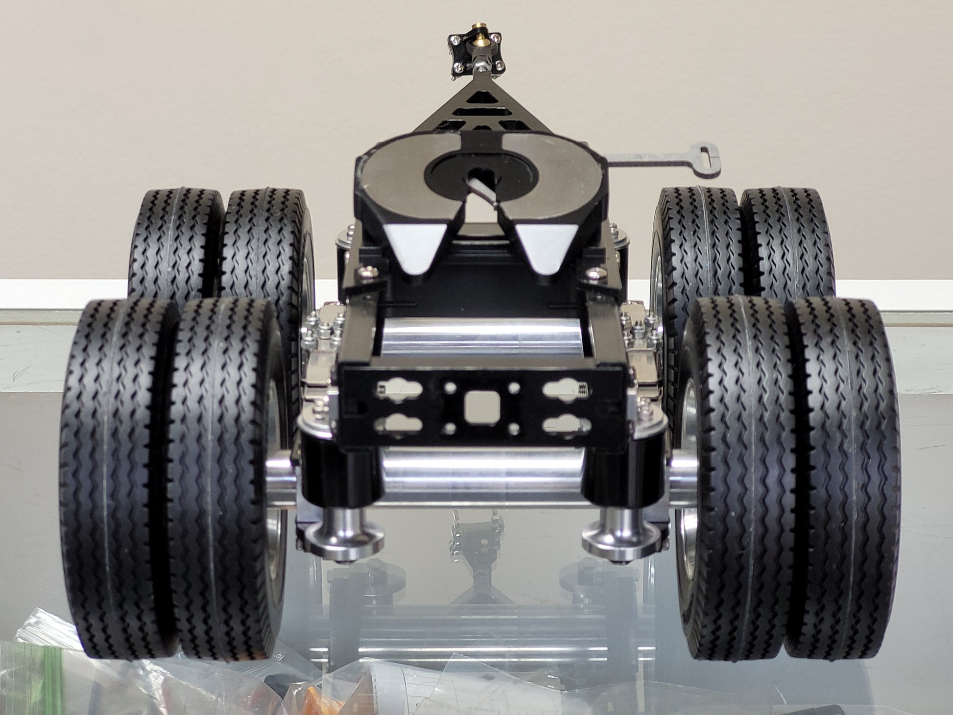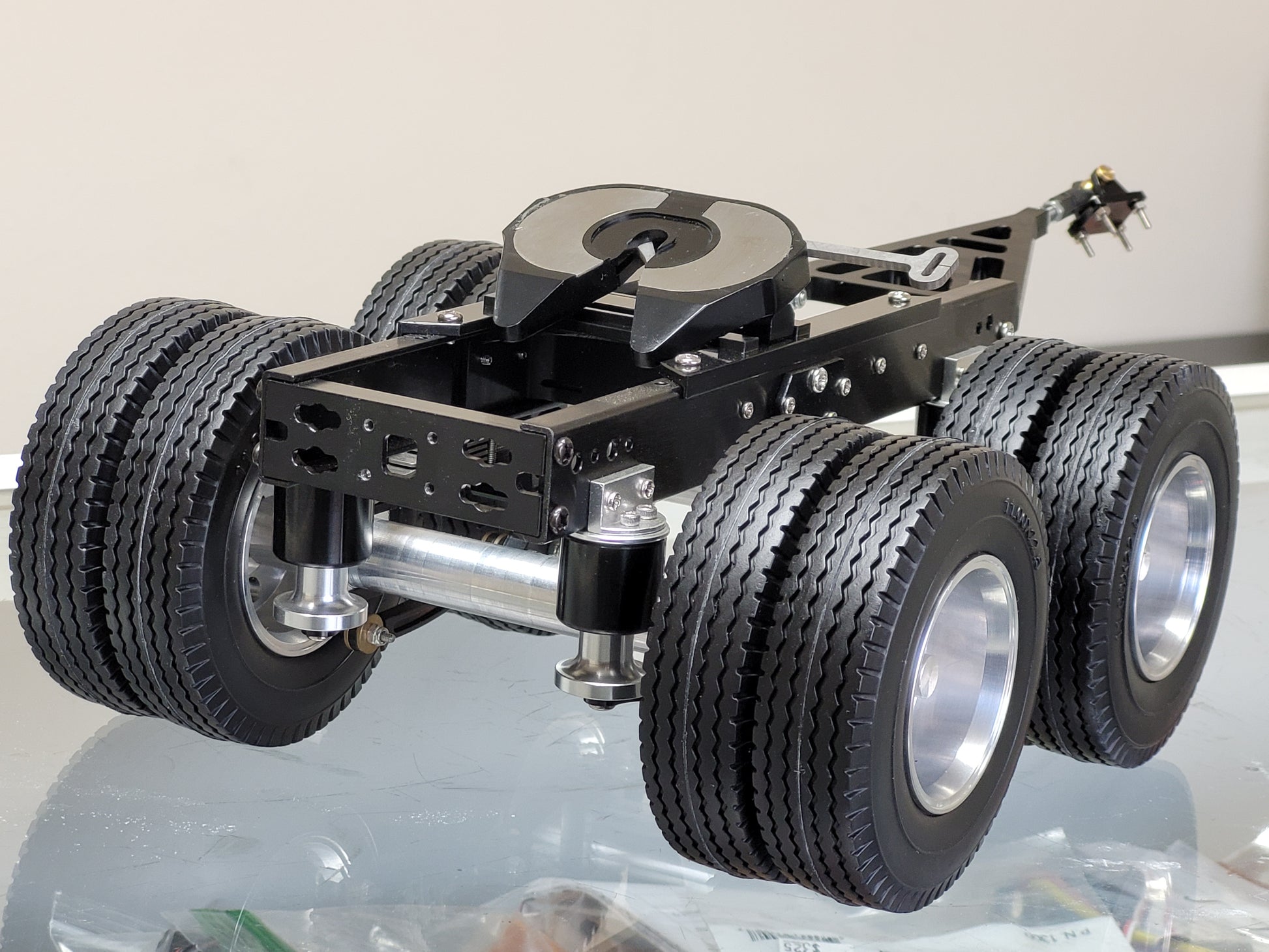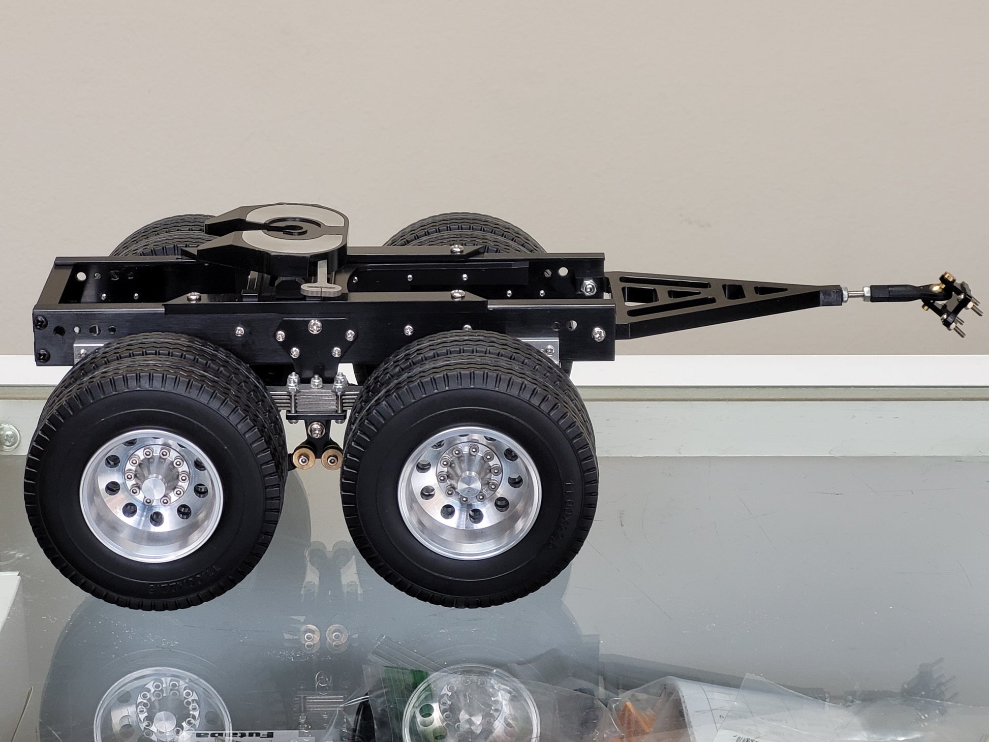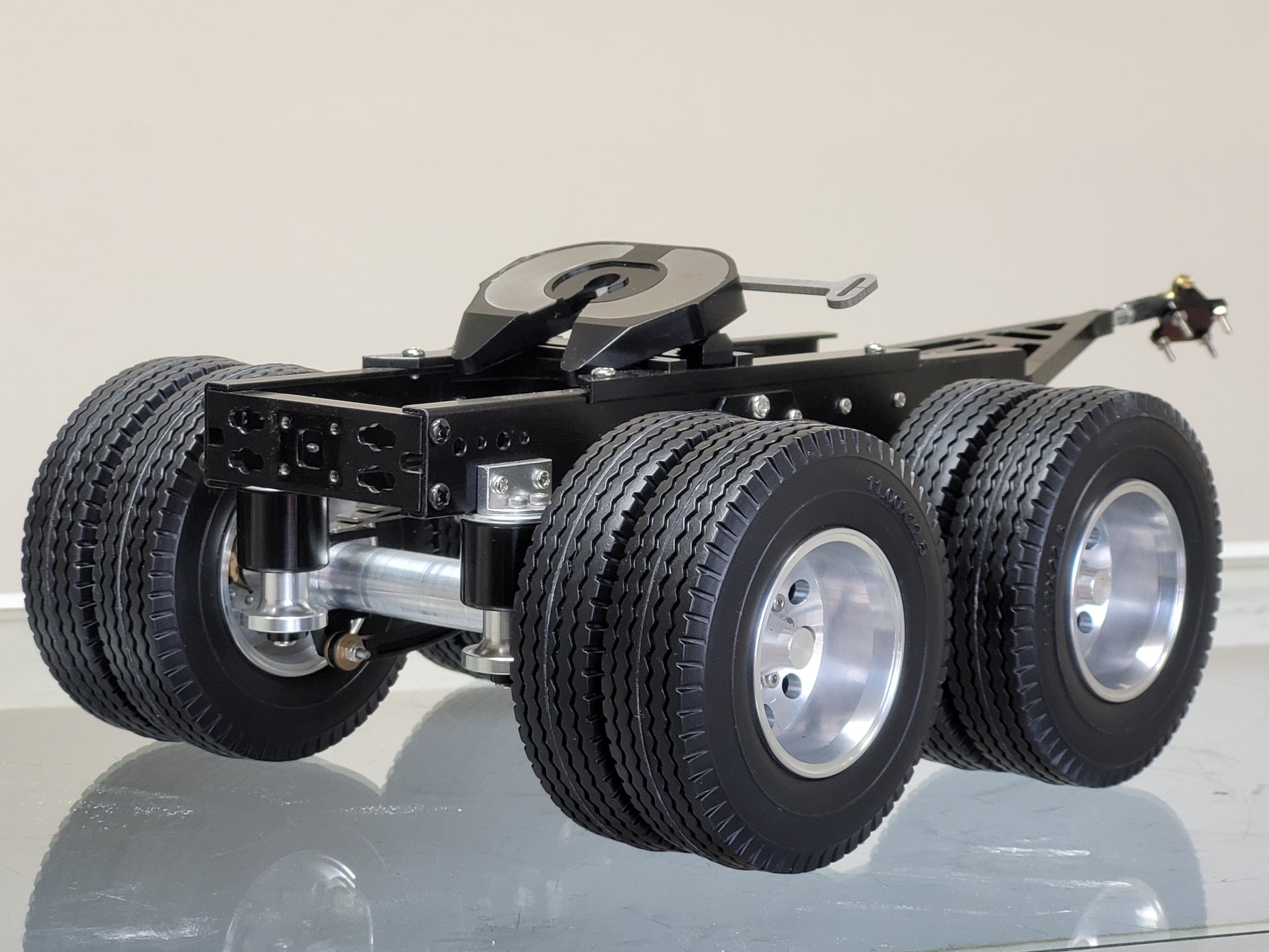 This custom-made Tamiya 1/14 scale R/C Semi Tractor Trailer Dolly features a full aluminum construction with two axles, pin mount style attachment, and a rear 5th wheel coupler. Measuring approximately 12.5 inches long, 4.5 inches high, and 7.25 inches wide, it includes realistic airbag and leaf spring suspension, aluminum rims, fifth wheel, and frame. Securely mount it to your semi truck using four bolts. For any inquiries, feel free to reach out.