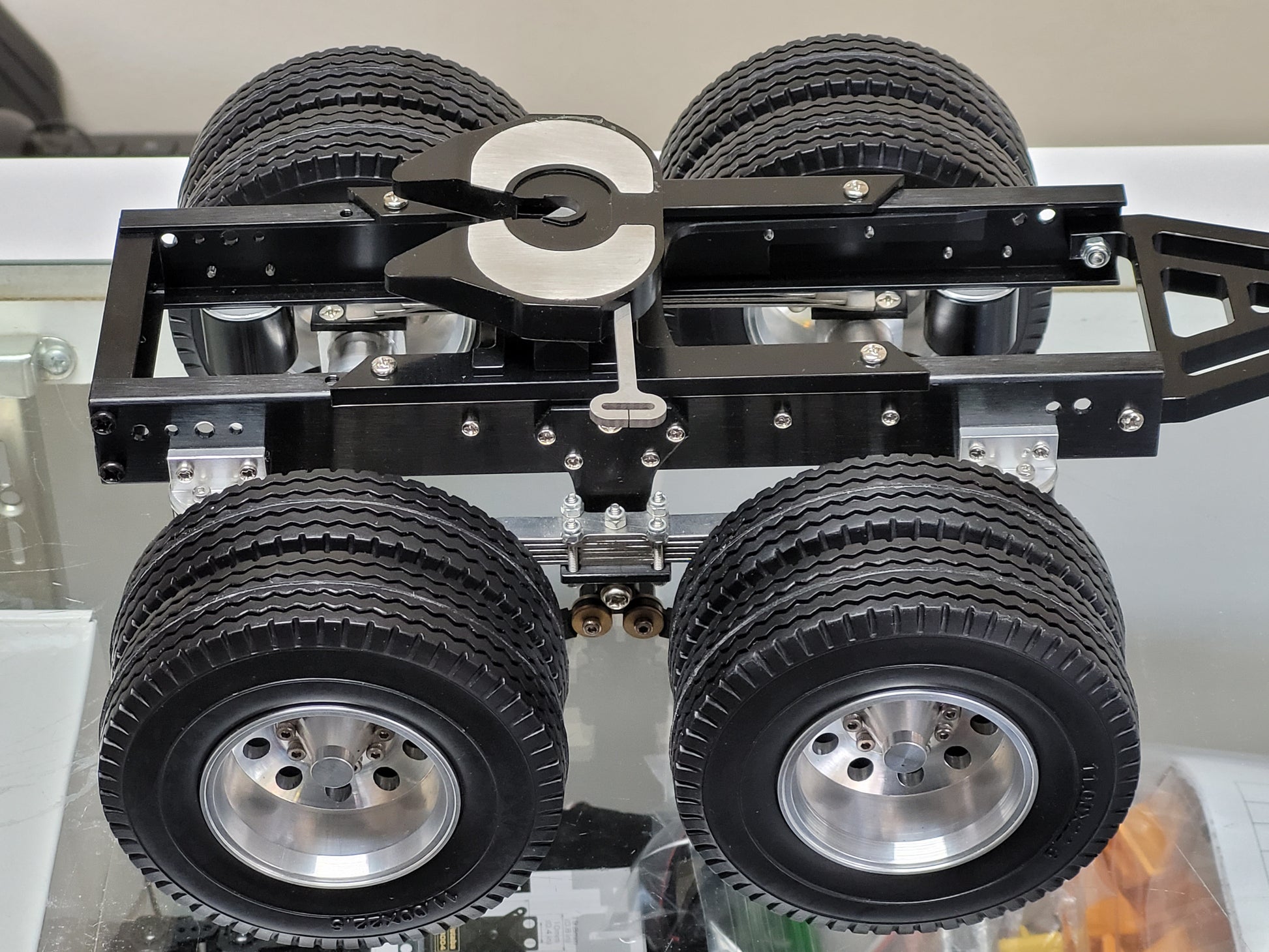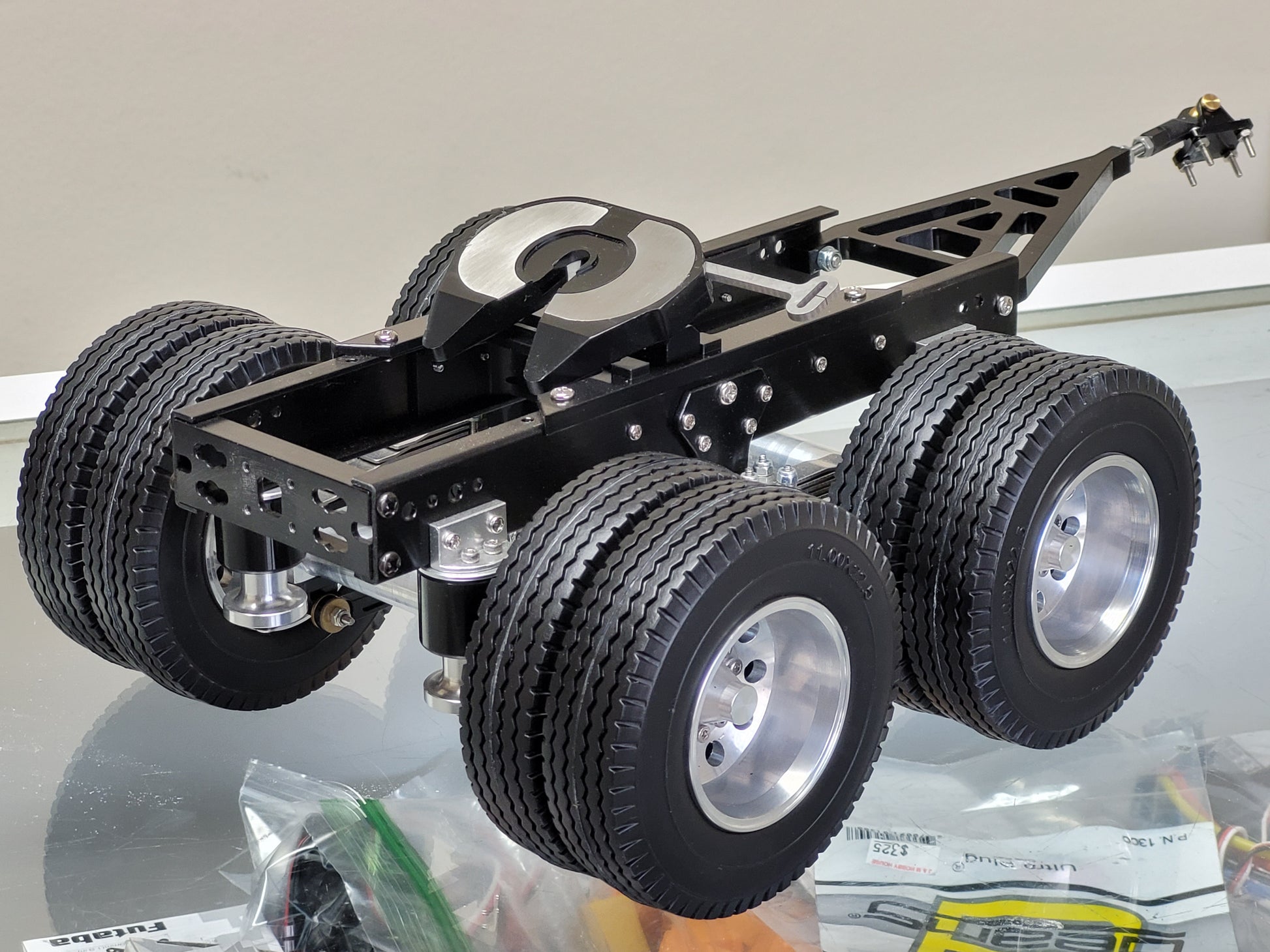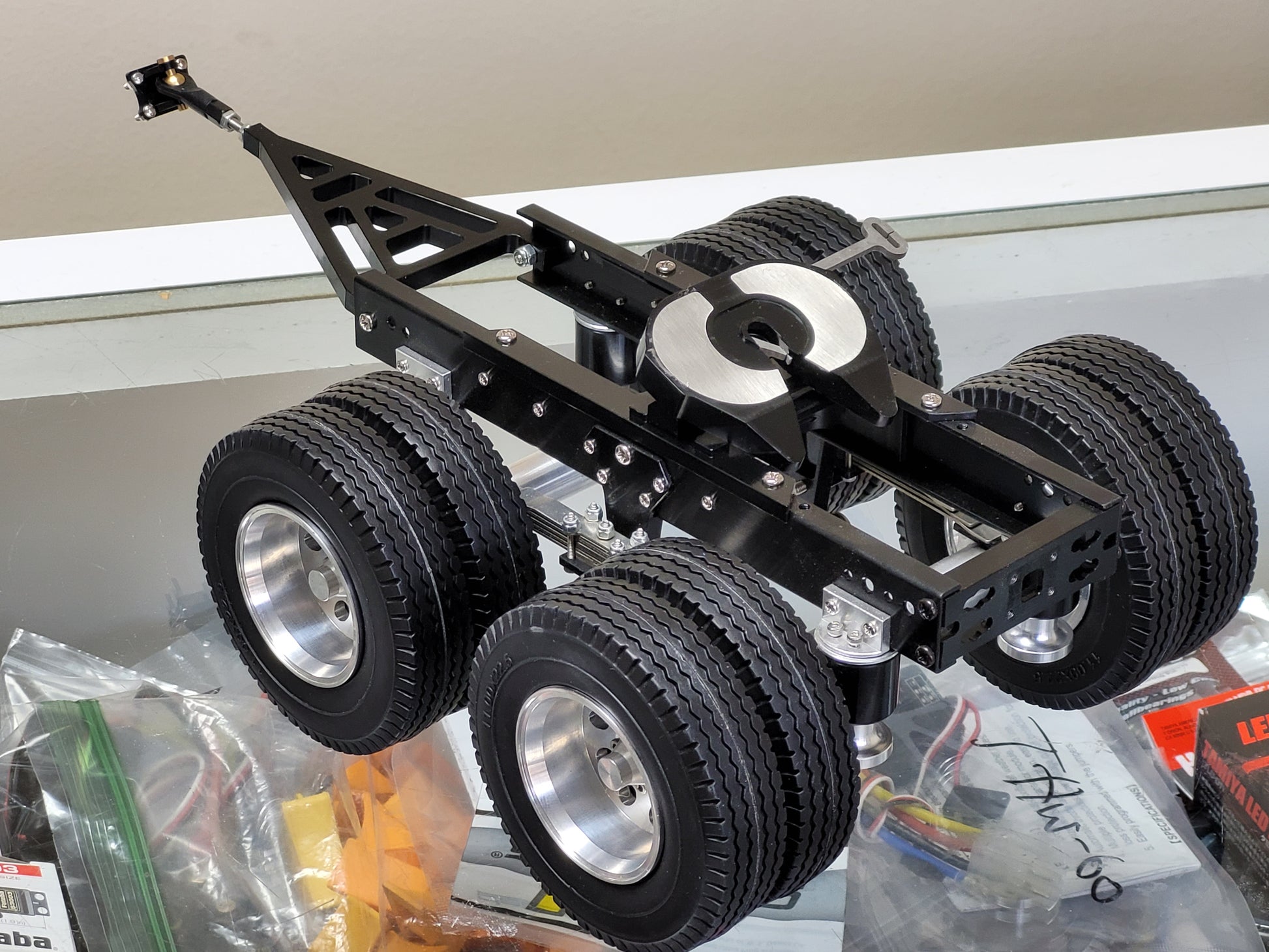 This custom-made Tamiya 1/14 scale R/C Semi Tractor Trailer Dolly features a full aluminum construction with two axles, pin mount style attachment, and a rear 5th wheel coupler. Measuring approximately 12.5 inches long, 4.5 inches high, and 7.25 inches wide, it includes realistic airbag and leaf spring suspension, aluminum rims, fifth wheel, and frame. Securely mount it to your semi truck using four bolts. For any inquiries, feel free to reach out.