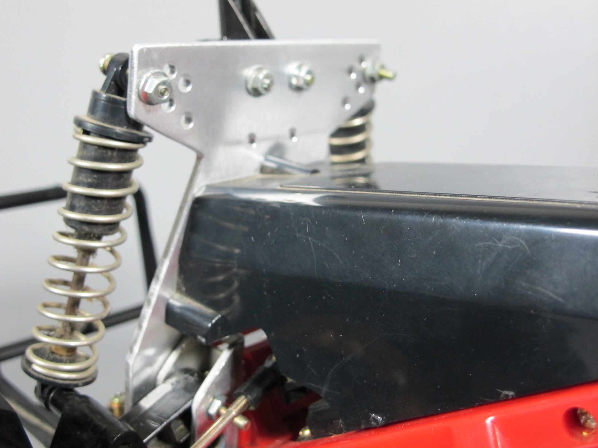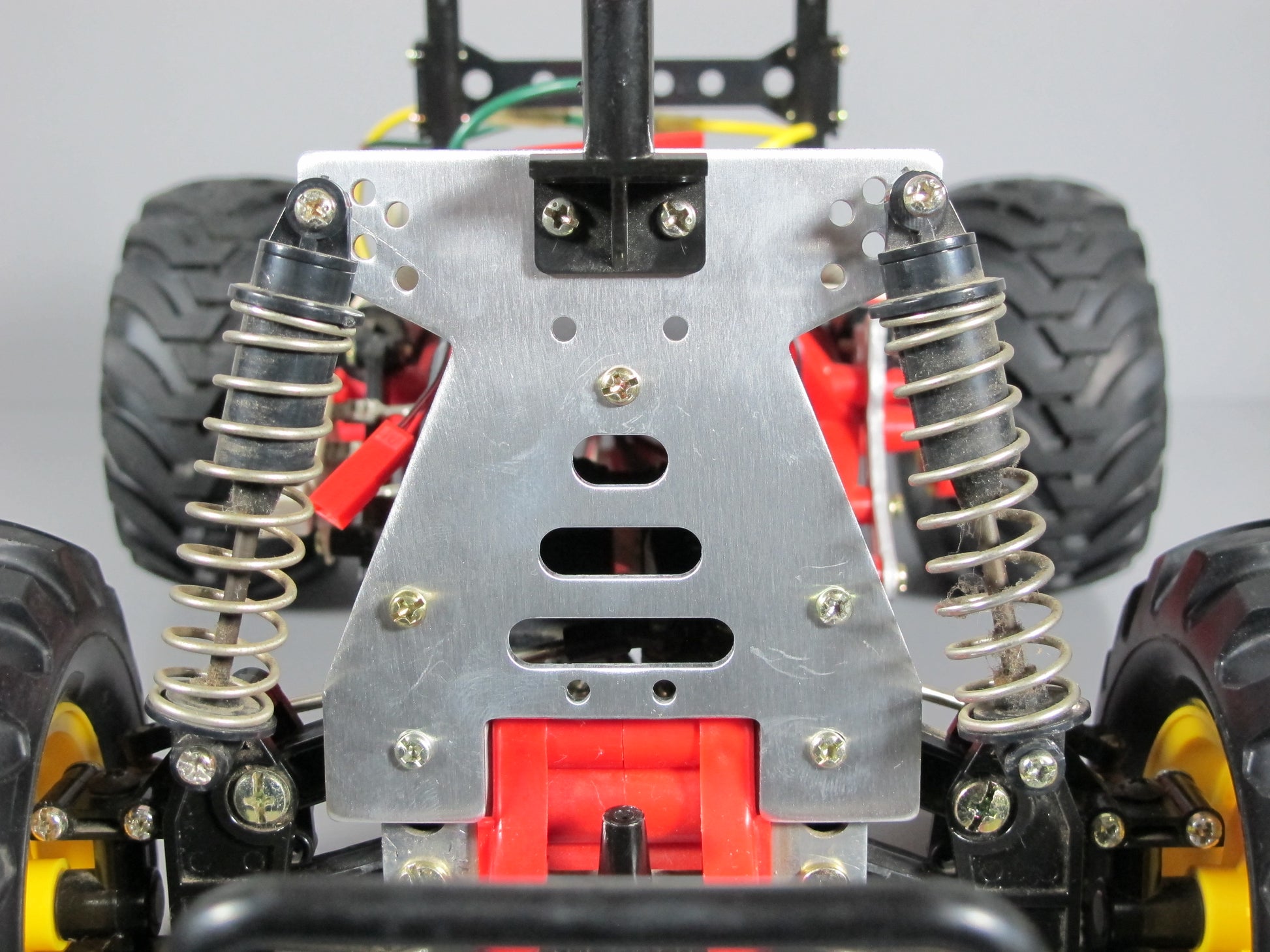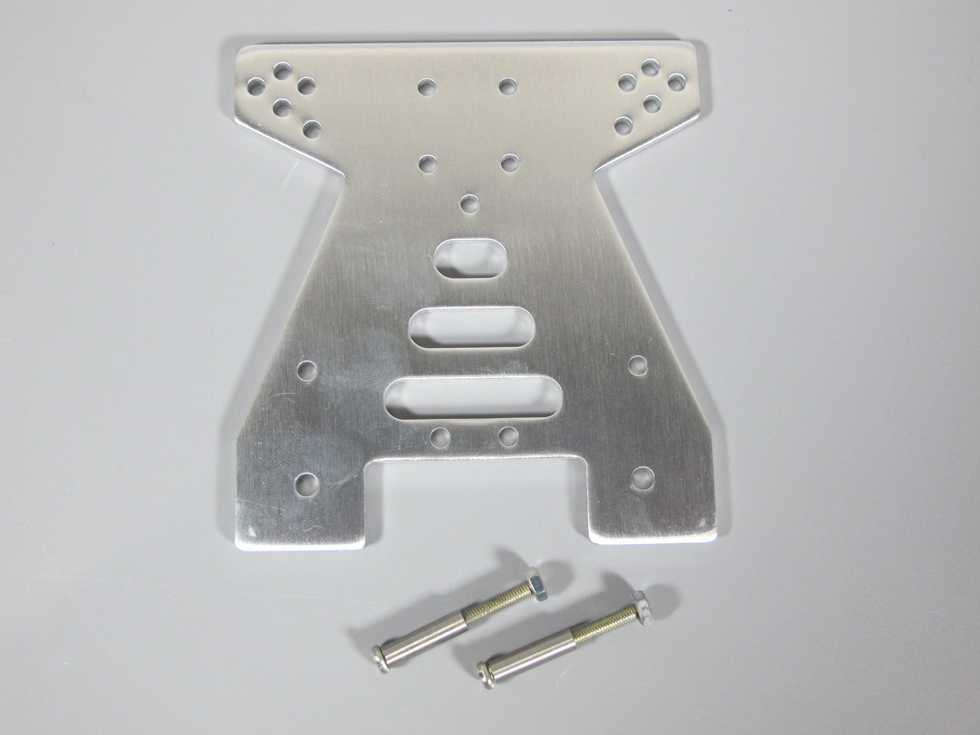 Aluminum adjustable Front Suspension Shock Tower Bracket Plate for 1/10 Remote Control Car Tamiya Mud Blaster, Blackfoot, Monster Beetle, and Lancia Rally. Remove the front plastic plate replace with this aluminum plate. Truck show in picture only for reference not include.